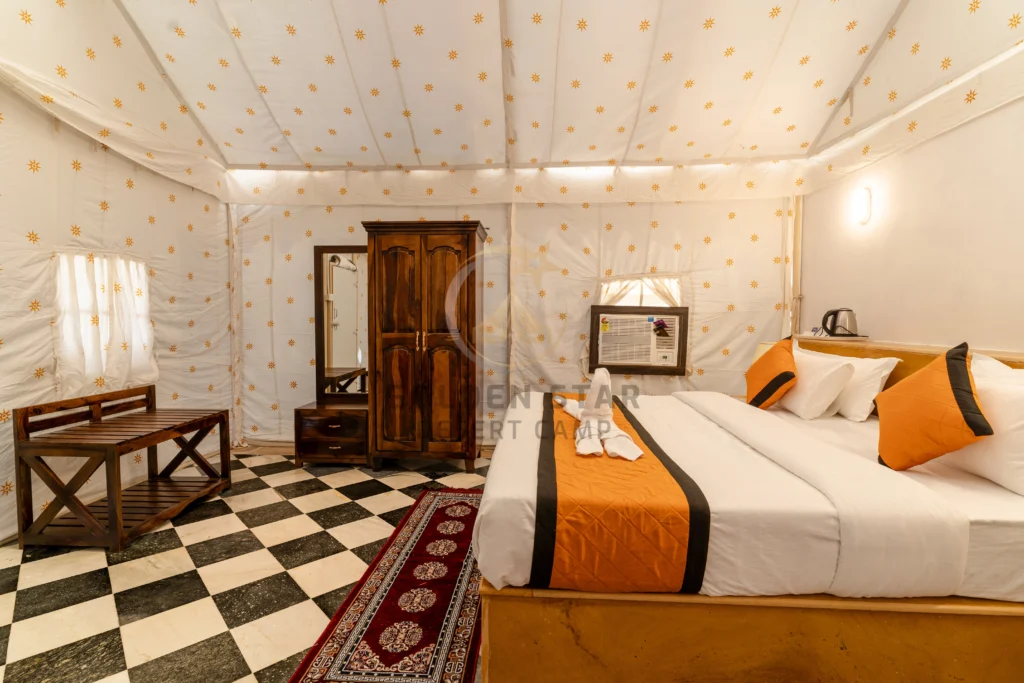 Discover the pinnacle of luxury at Golden Star Desert Camp, where nature and elegance come together in perfect harmony. Our luxury tent accommodations redefine opulence and serenity, offering an unforgettable outdoor experience. Each beautifully designed tent exudes spacious elegance, featuring premium furnishings, plush bedding, and modern amenities that ensure your utmost comfort.
